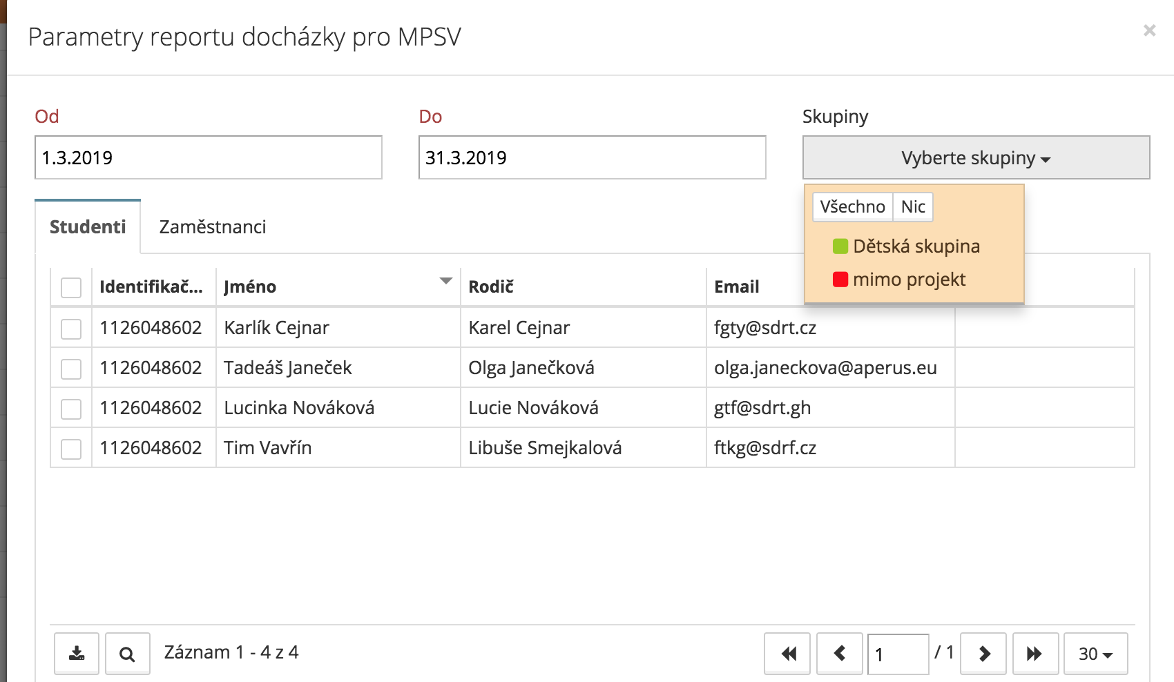 - v záložce studenti vyberete studenty, které chcete zahrnout do reportu (zaškrtávátkem vlevo nahoře můžete označit všechny najednou)