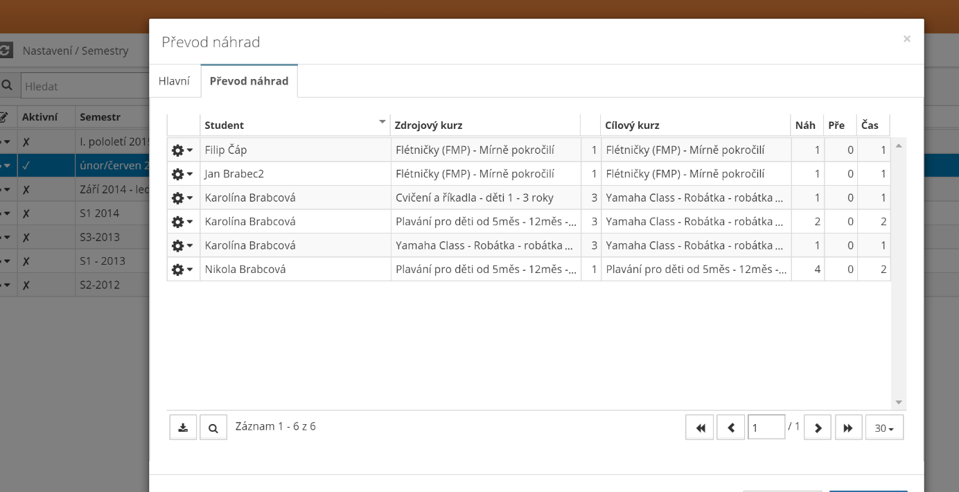 1. Každý semestr je možné převést jen do jednoho cílového semestru. Tento semestr musí být již vytvořený a musí v něm být naplánované kurzy i zaregistrovaní studenti, aby bylo možné tyto náhrady převést. Než začnete náhrady převádět, musíte si u každého cílového kurzu nastavit, kolik se převádí náhrad a do kdy je musí klienti vyčerpat.