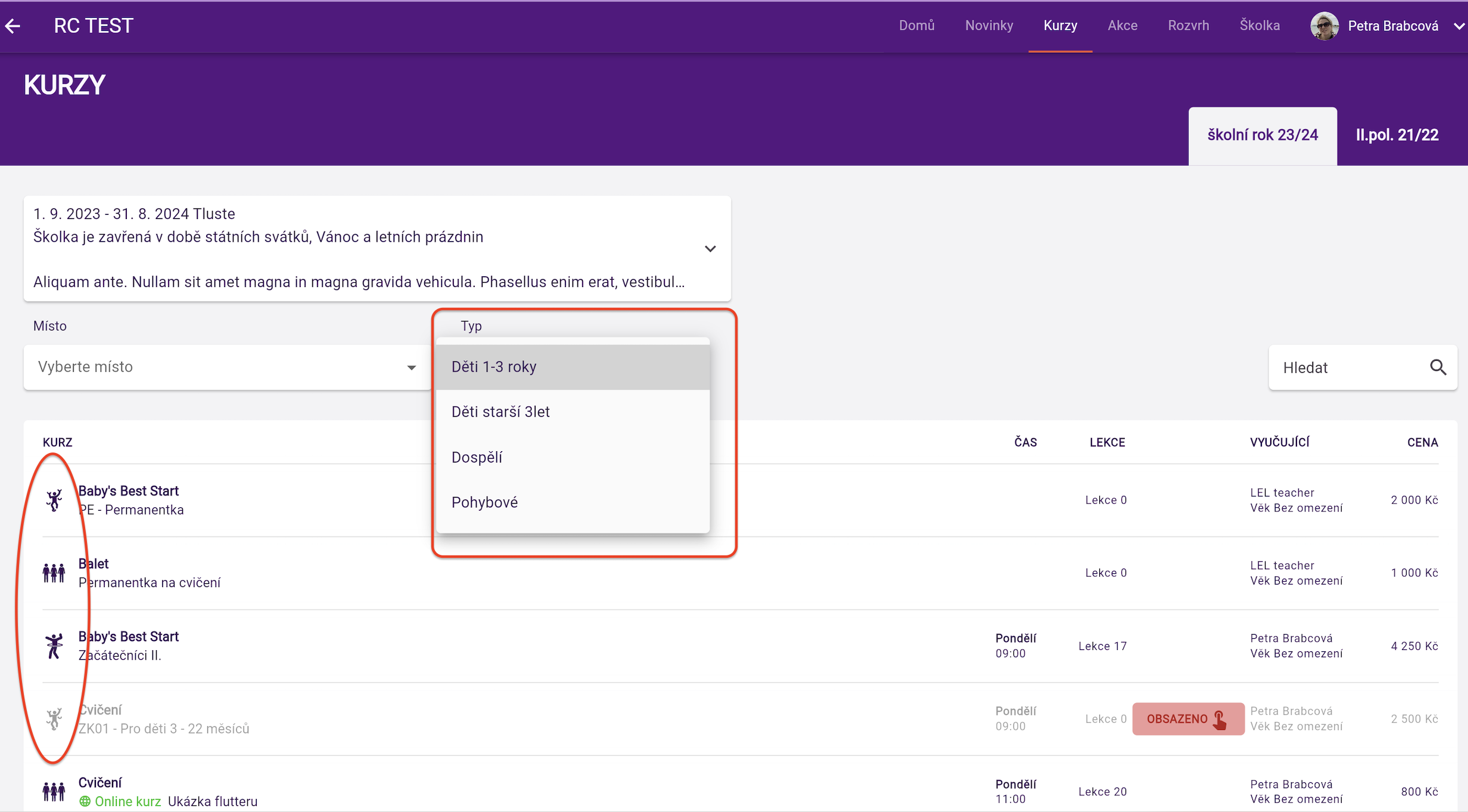 Typy kurzů slouží jako filtr pro výběr kurzů v klientské sekci. Usnadníte takto vašim novým klientům snazší výběr z vaší nabídky kurzů.