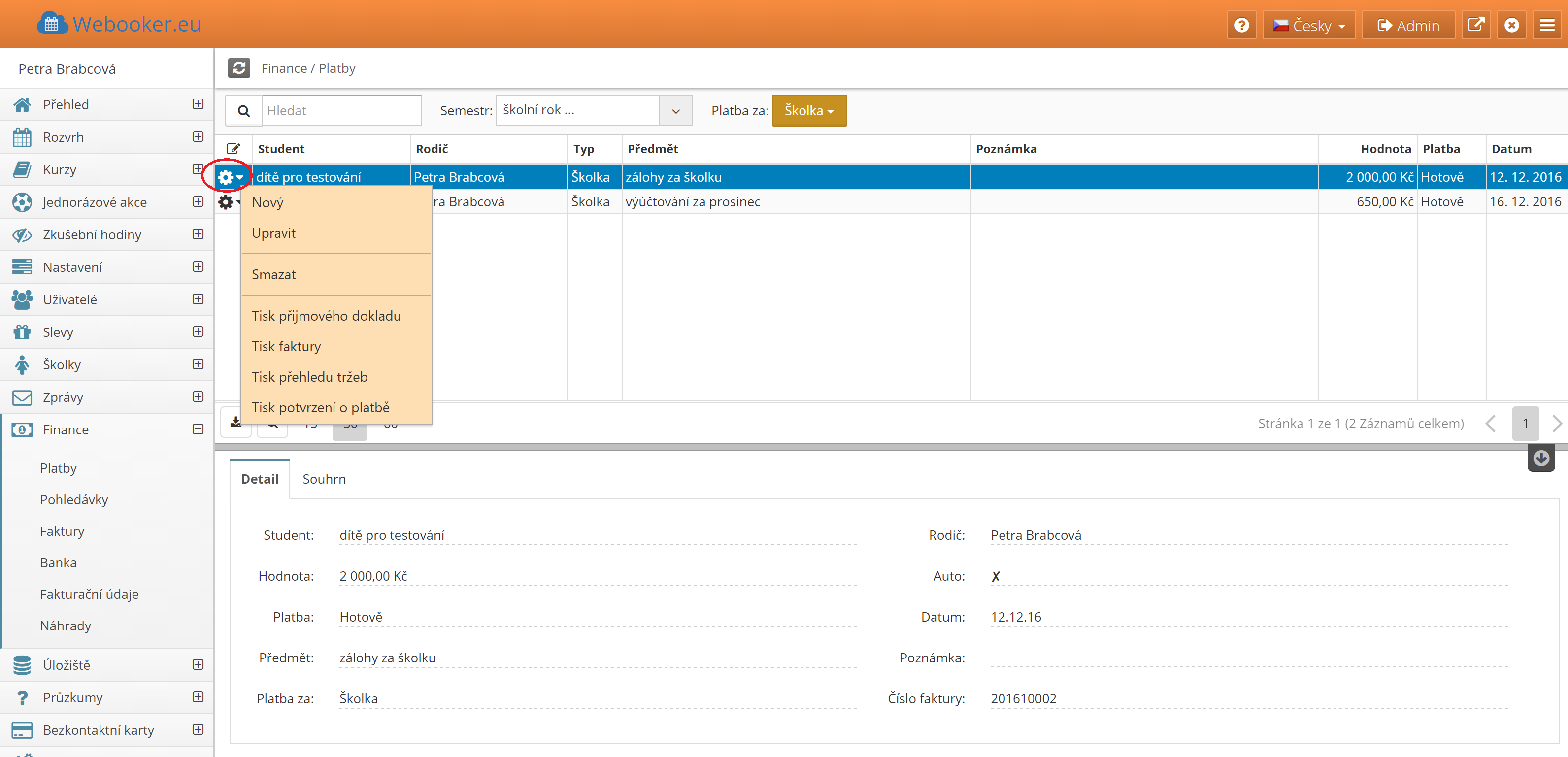 Pokud chcete vytvořit, upravit nebo smazat platbu za dítě jdete do Finance/Platby,