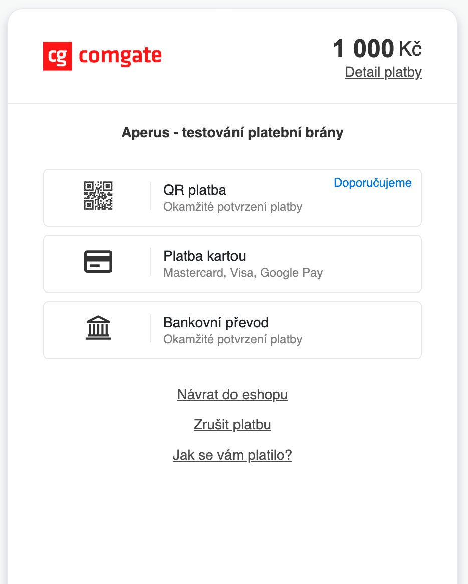 1. Nejprve je potřeba nás kontaktovat na e-mail sales@aperus.eu, abychom připravili propojení s Comgate - provozovatelem platební brány.