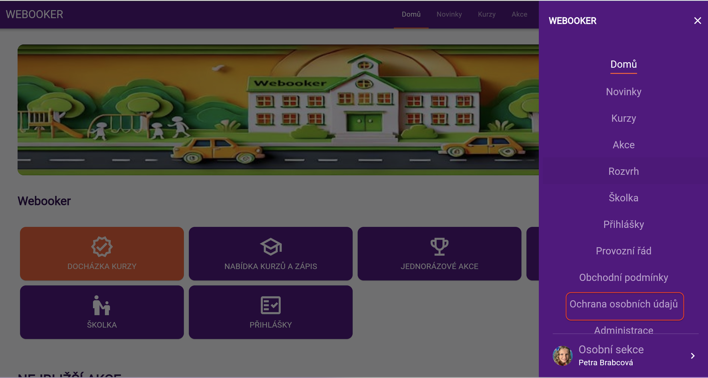 V klientské sekci se „Ochrana osobních údajů“ zobrazí v menu pod jménem přihlášeného uživatele.