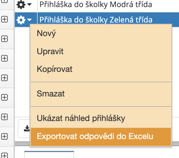 Export všech odpovědí uděláte na ozubeném kolečku u přihlášky: