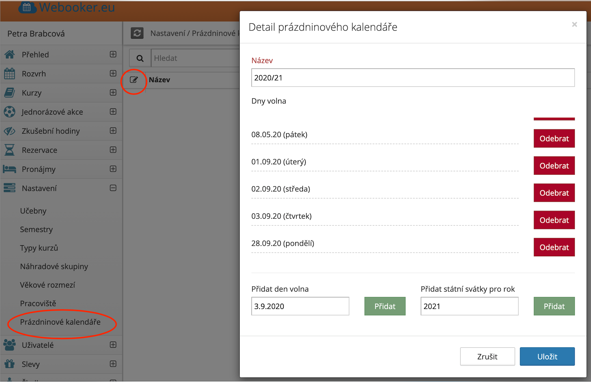 V sekci nastavení najdete modul Prázdninové kalendáře. V tomto modulu si můžete připravit svůj vlastní kalendář dní, na které nebude systém při tvoření kurzů (sérii lekcí) nebo při kopírování kurzů plánovat žádné lekce.