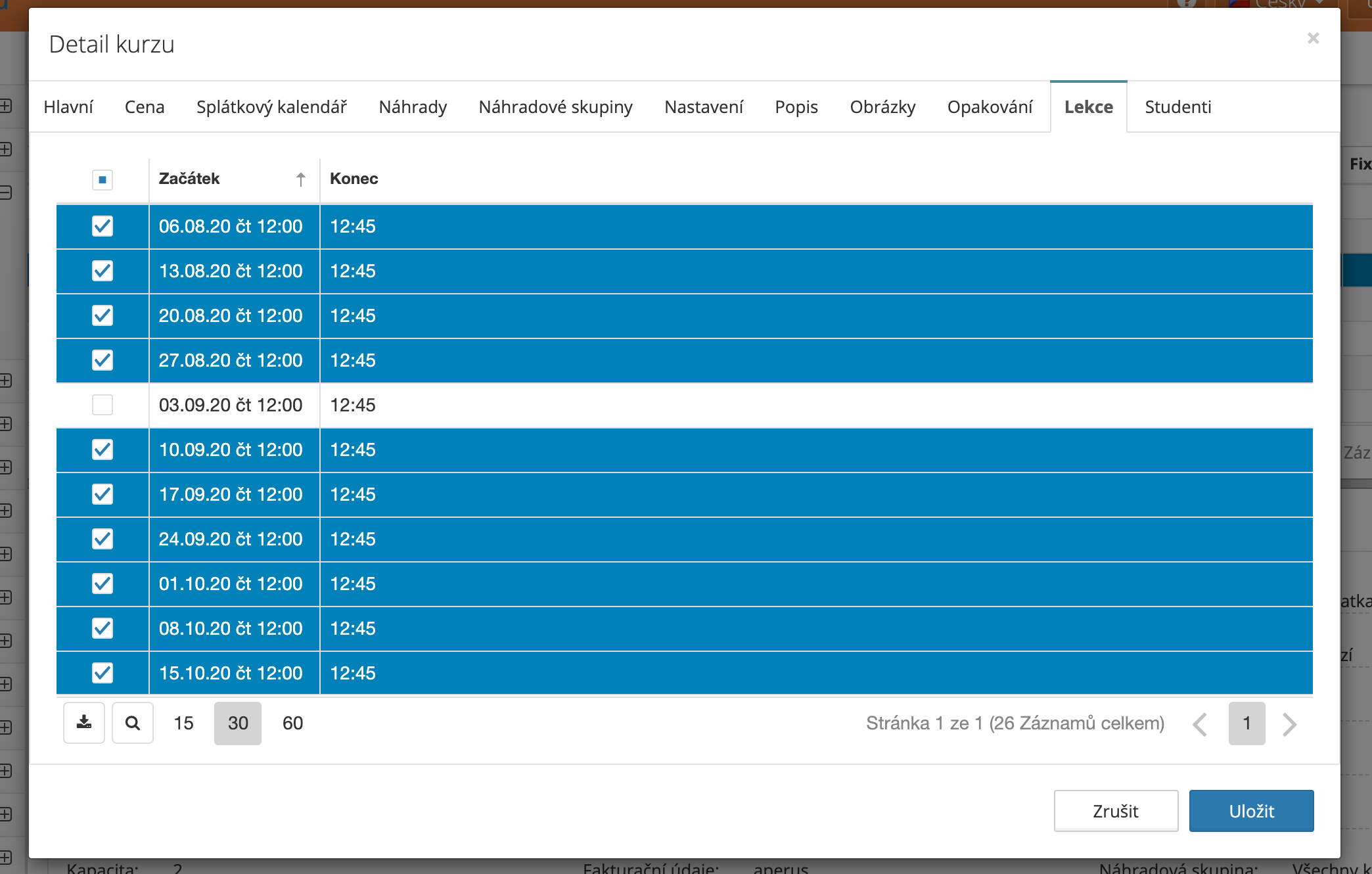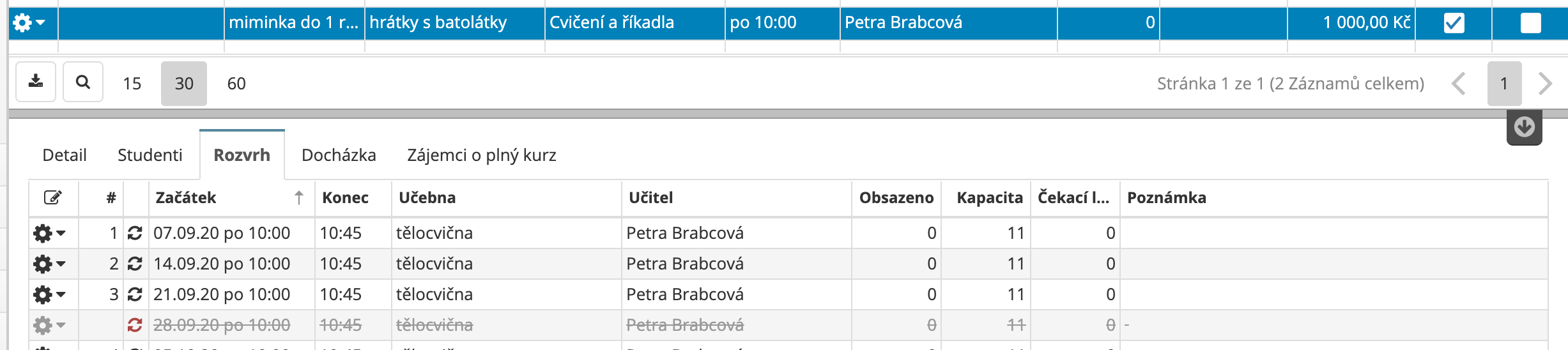 Pří tvorbě nového kurzu se lekce označí se jako zrušené. (nejsou vidět v docházce ani v klientské účtu. Dle potřeby je lze obnovit