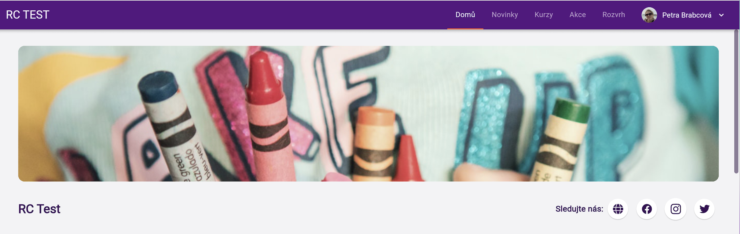 Texty tlačítek i položek v horní liště menu se zobrazují podle toho, jaké moduly v systému využíváte (školka, nabídka kurzů, přihlášky, rezervace, omluvy a náhrady, odcházky atd.). Tyto texty si můžete přizpůsobit dle svých potřeb.