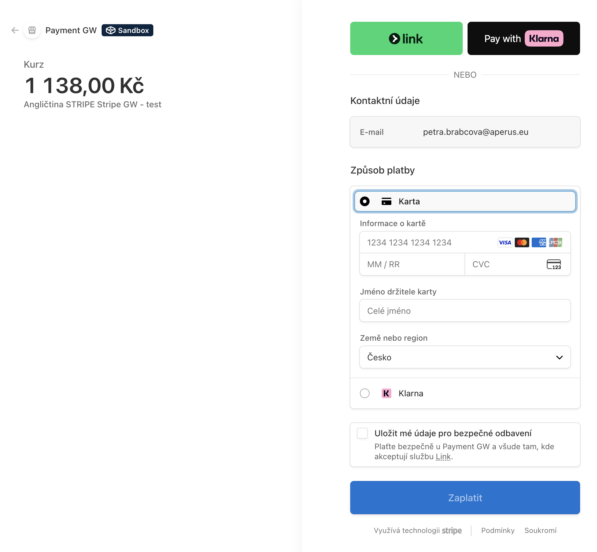 Tip: Stripe nabízí Sandbox prostředí, kde si můžete vyzkoušet platby bez skutečných peněz.