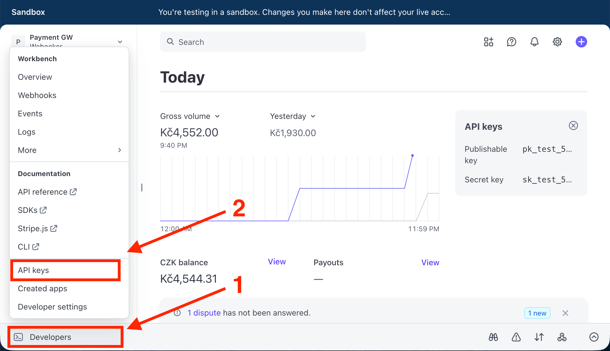 V Stripe Dashboard klikněte vlevo dole na Developers