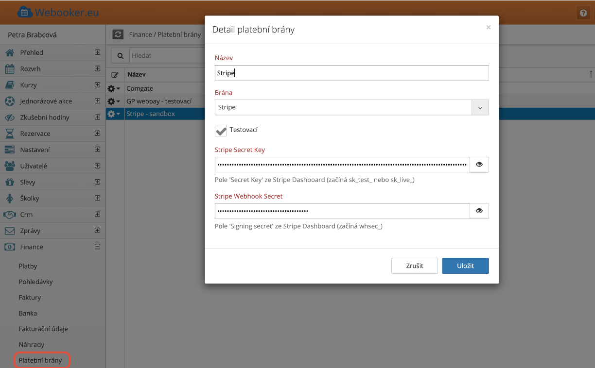 Nastavení platební brány Stripe pro Webooker