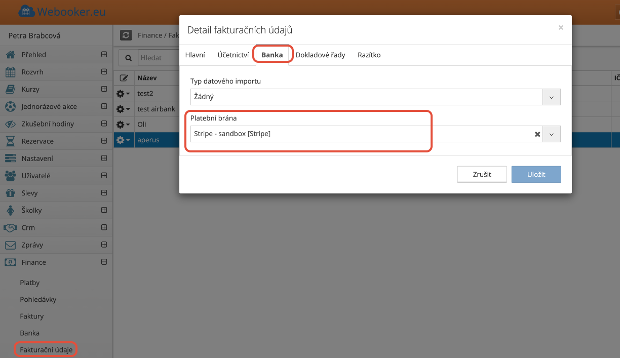 V sekci banka vyberte vámi vytvořenou Stripe platební bránu