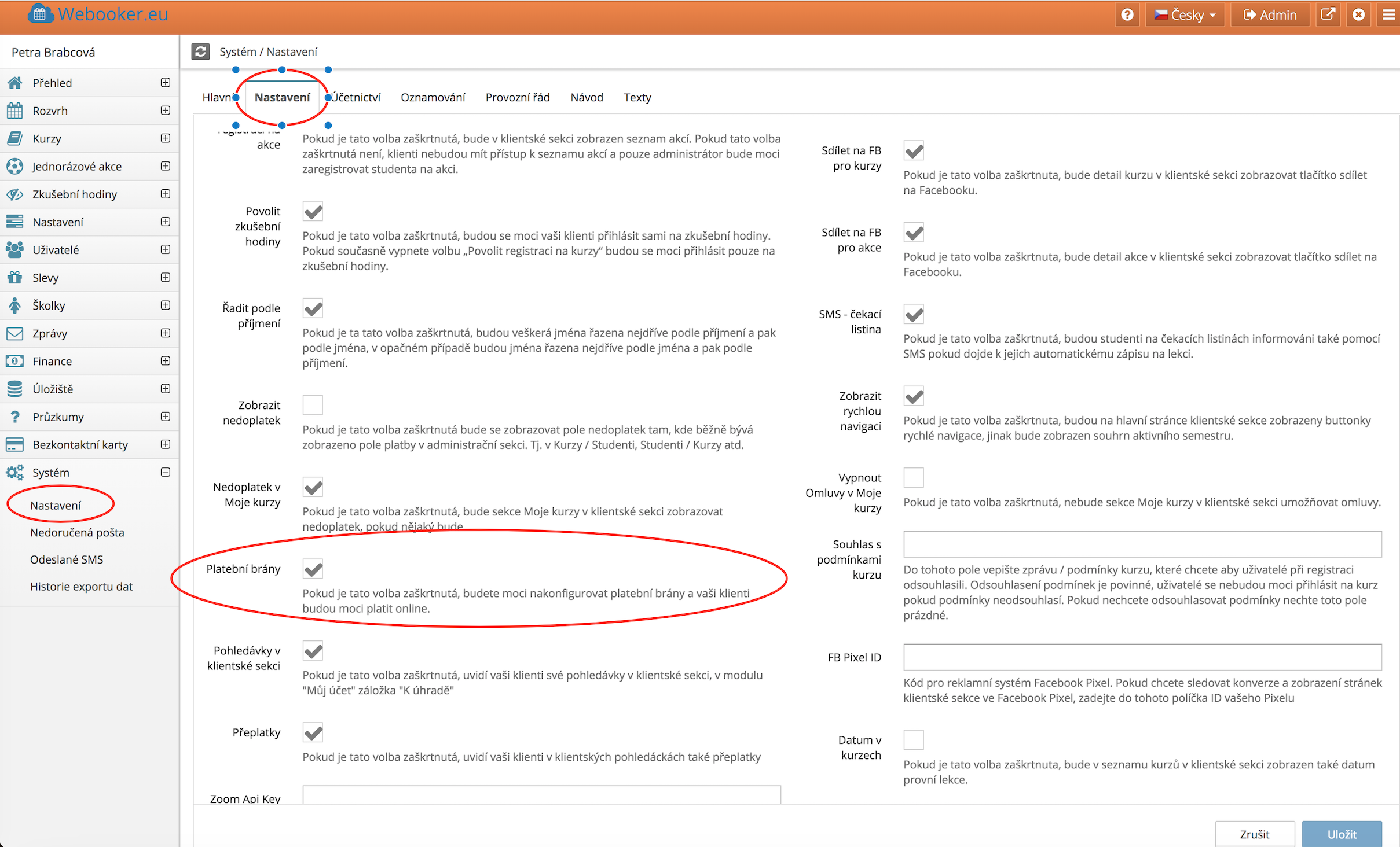 Nejprve je potřeba zapnout v sekci "Systém - nastavení" funkci platební brány