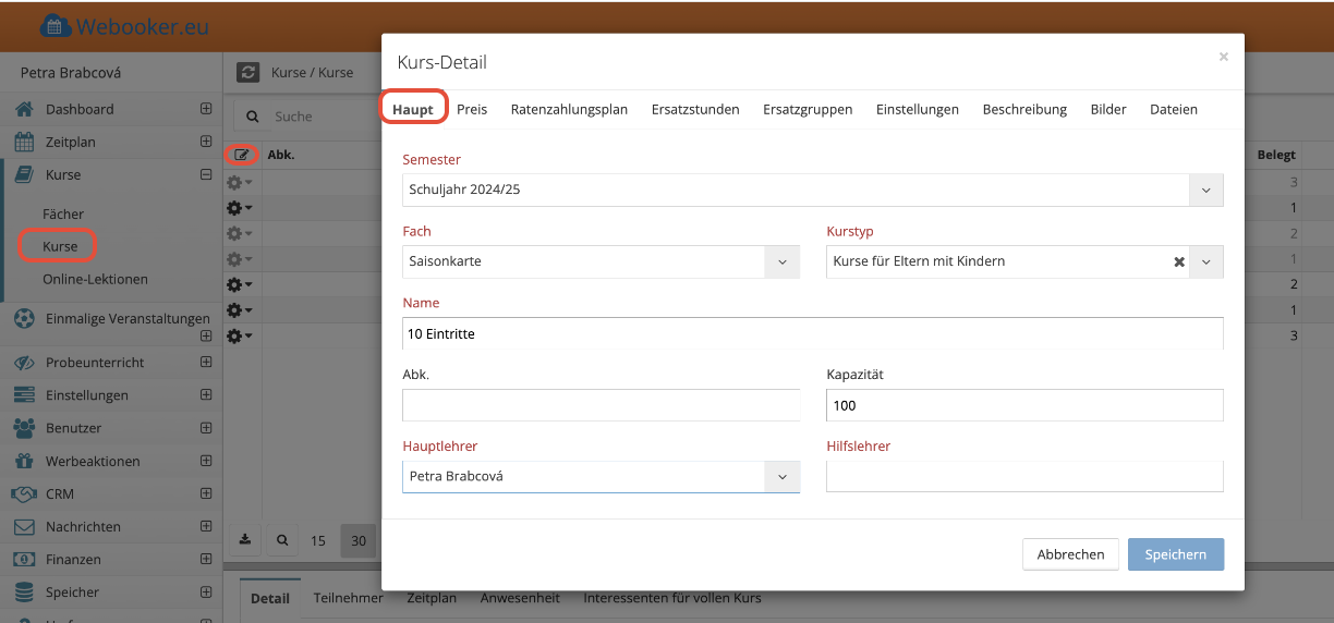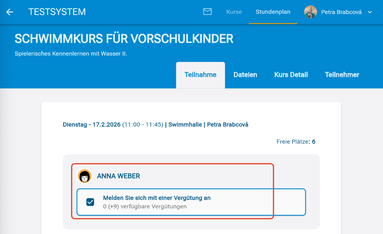 Der erstellte Kurs wird den Kunden anschließend nur im Kursangebot angezeigt. Sie können ihn kaufen und das System erstellt automatisch eine Rechnung. Mit dem Kauf der Saisonkarte wird die festgelegte Anzahl an Ersatzstunden ihrem Konto gutgeschrieben.