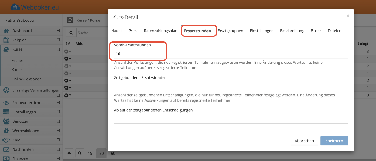 Die Anzahl der Eintritte legen Sie fest, indem Sie im Tab Ersatzstunden die Anzahl der Vorab-Ersatzstunden eingeben.