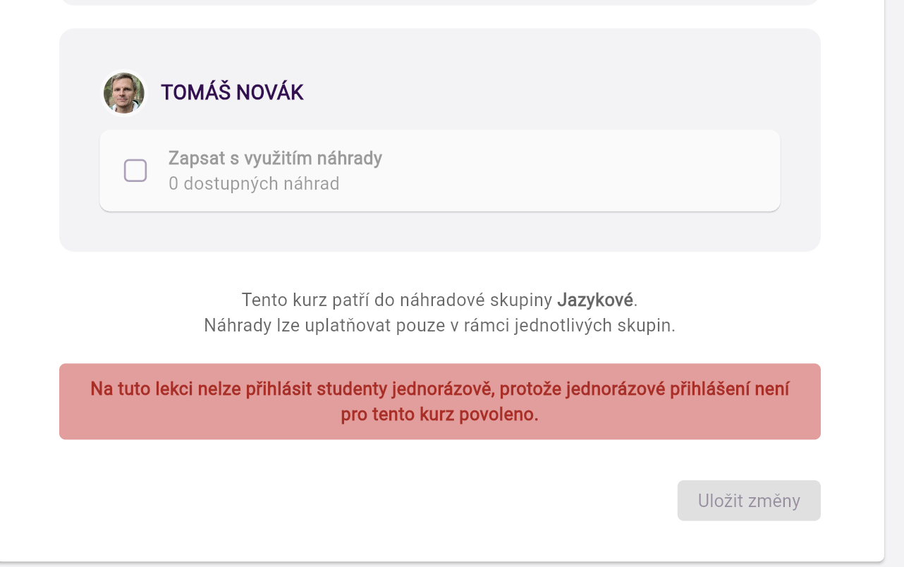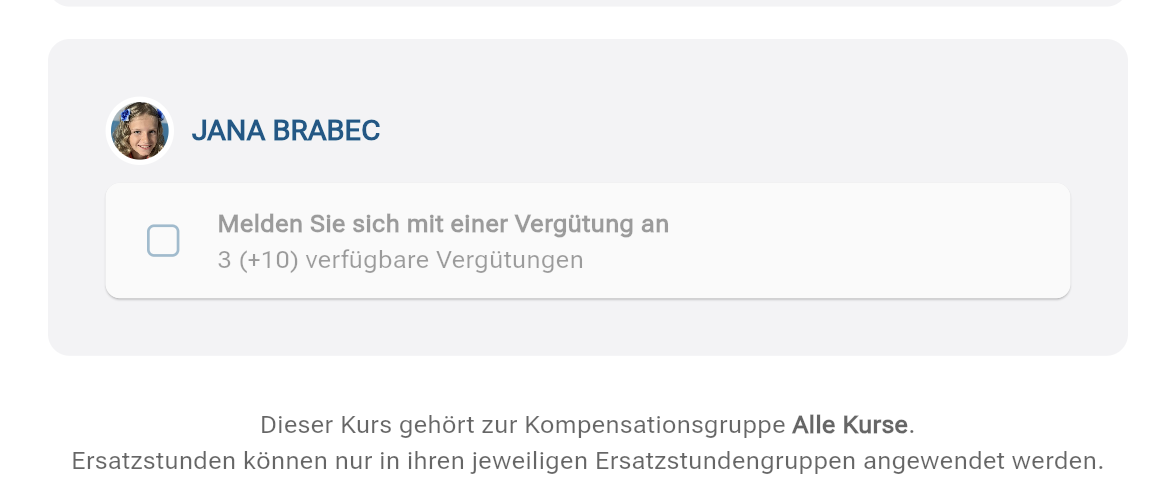 Das System erlaubt es Kund:innen, Ersatzstunden nur innerhalb ihrer Ersatzgruppe zu buchen – und nur in Kursen, die so eingestellt sind, dass sie Ersatzstunden aus dieser Gruppe akzeptieren.