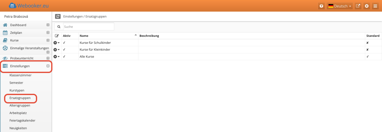 Im Bereich Einstellungen finden Sie die Ersatzgruppen. Ersatzgruppen dienen dazu, Kurse in Gruppen einzuteilen, in denen Ihre Kunden Ersatzstunden in Anspruch nehmen können.