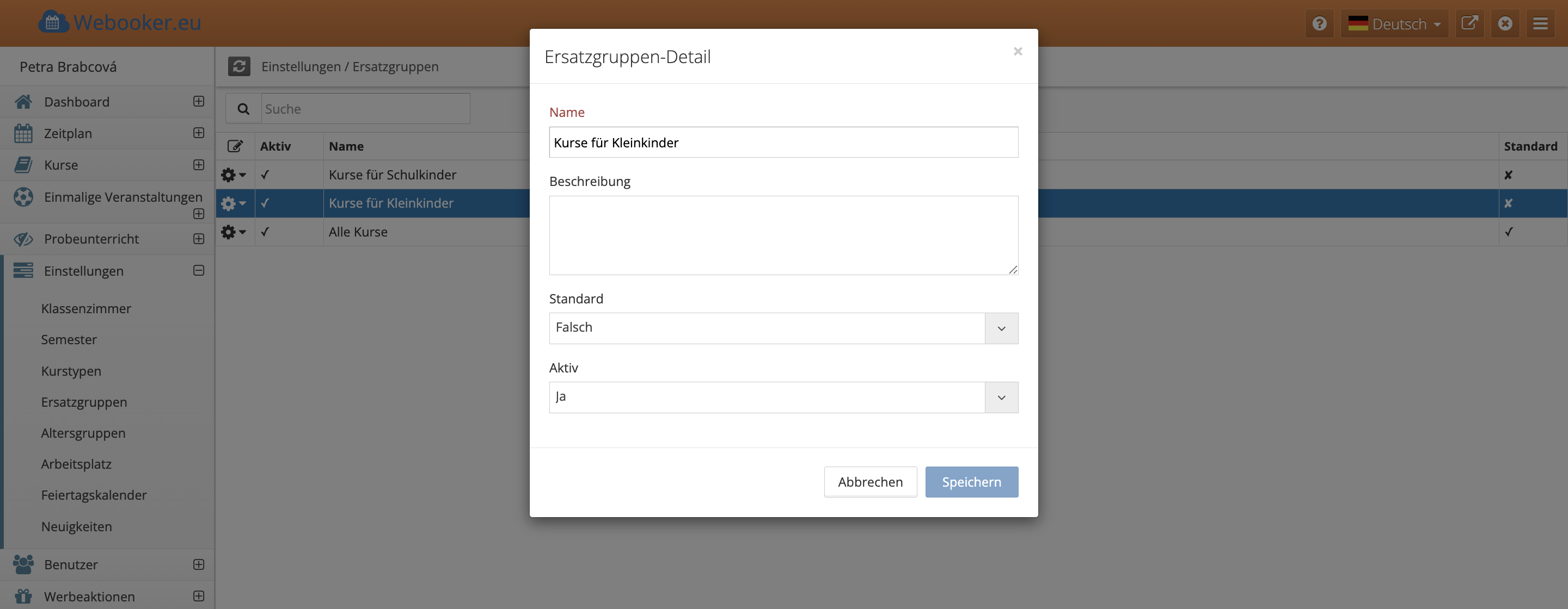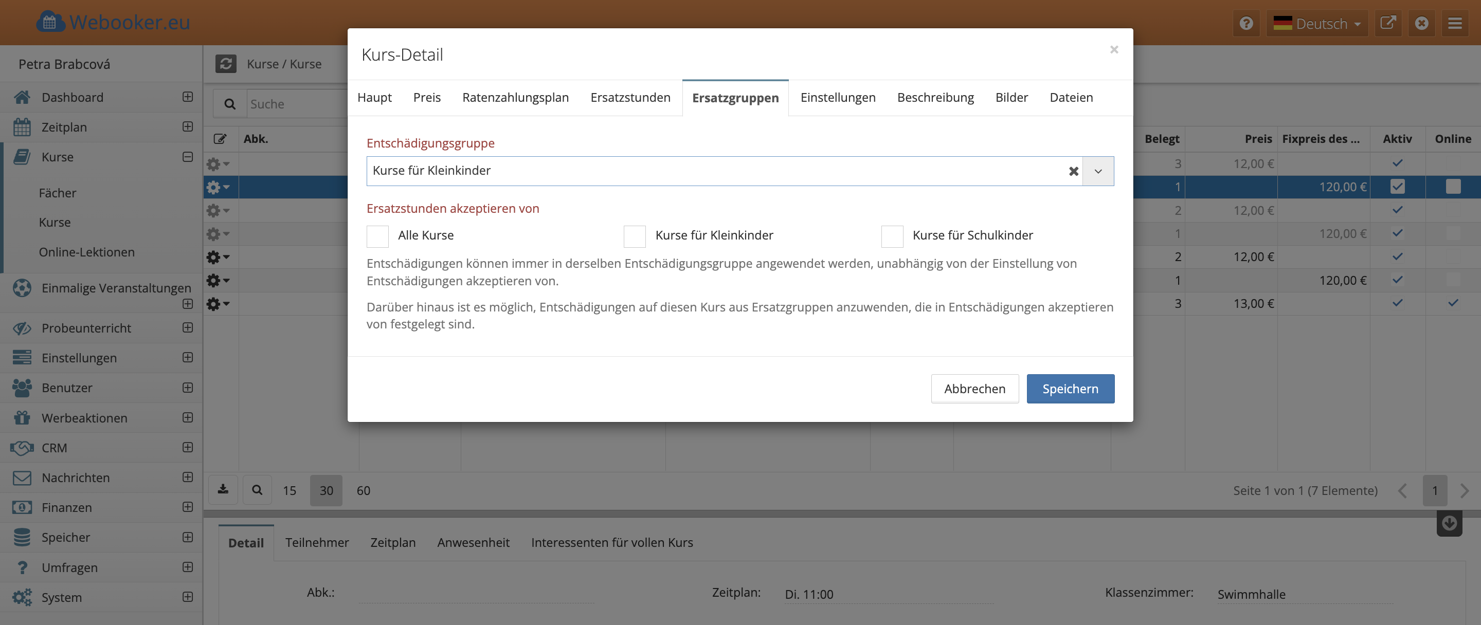 Im Bereich Kurse wählen Sie beim Erstellen eines Kurses aus, zu welcher Ersatzgruppe der Kurs gehören soll. Die Benutzer können dann Ersatzstunden innerhalb dieser Gruppe buchen.