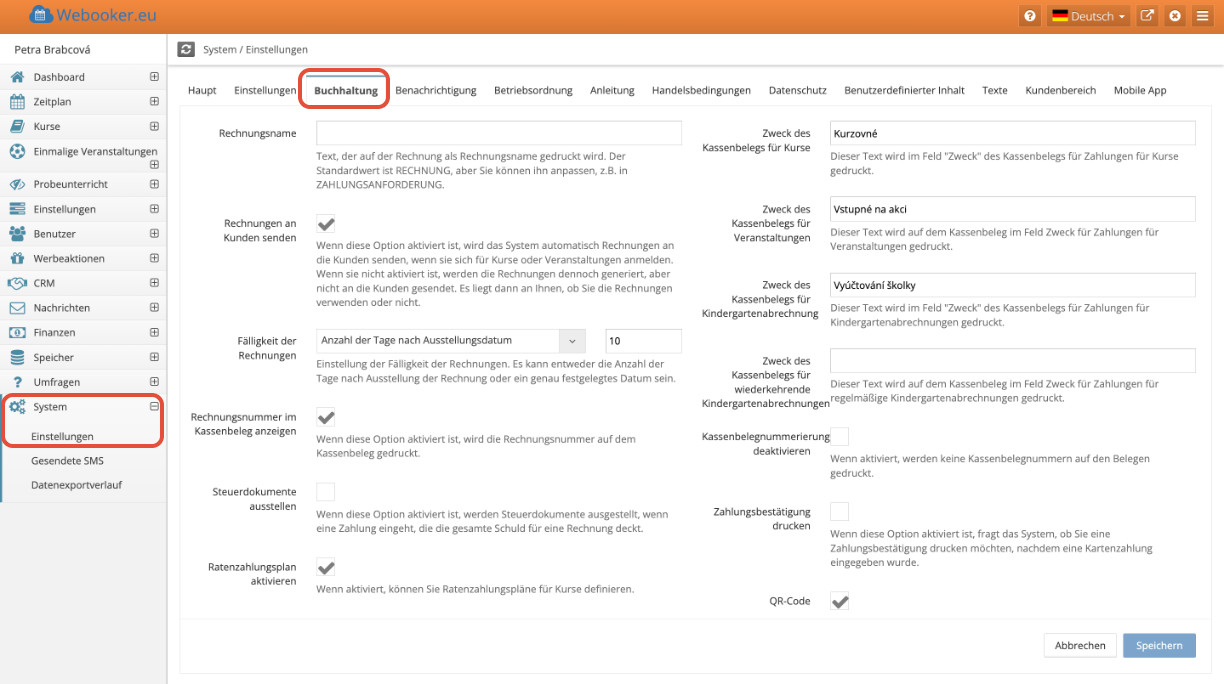 Die Rechnungen können Sie im Modul „System / Einstellungen“ im Tab „Buchhaltung“ konfigurieren.