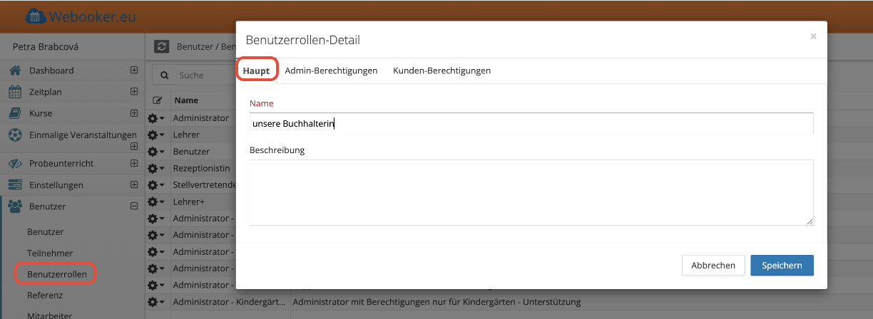 Im Tab „Haupt“ benennen Sie zunächst die Rolle; optional können Sie auch eine Beschreibung der gewählten Berechtigungen hinzufügen.