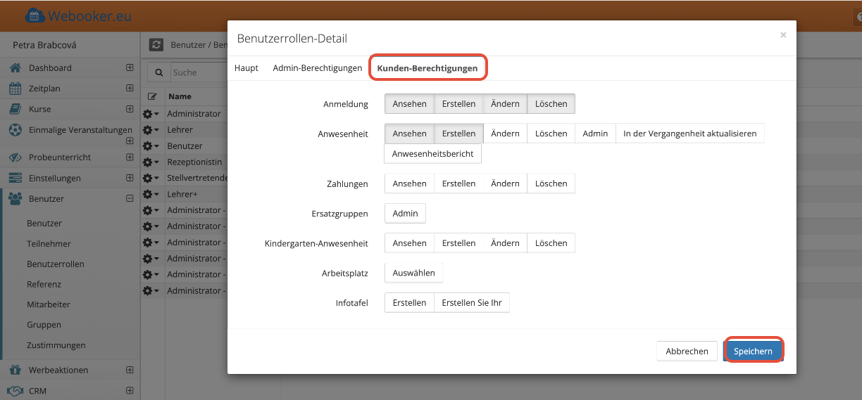 Im Tab „Kunden-Berechtigungen“ wählen Sie die Berechtigungen aus, die die Rolle im Kundenbereich zur Verfügung haben wird.