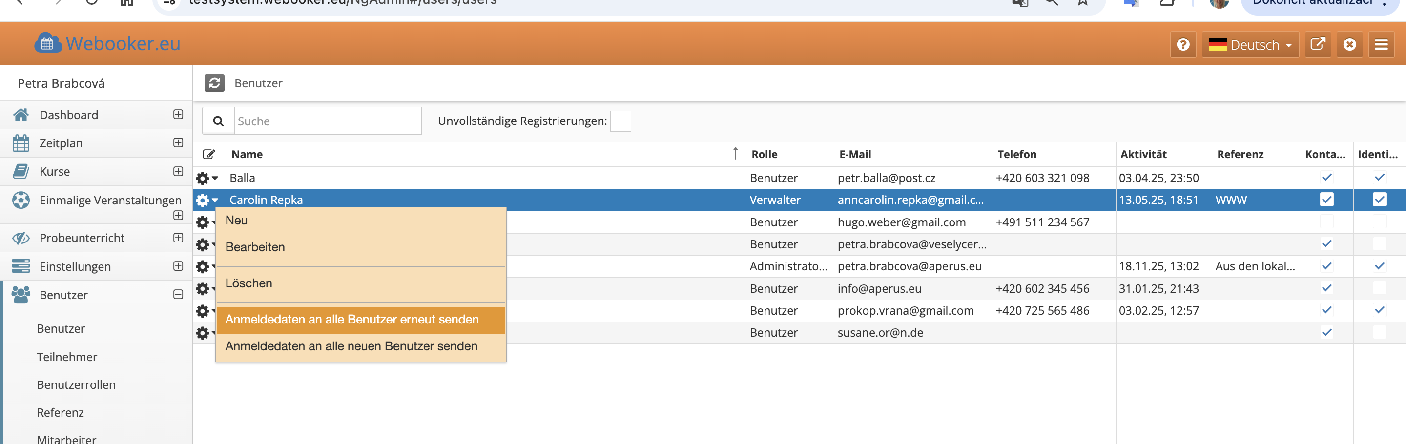 Im Modul „Benutzer“ → „Benutzer“ können die Zugangsdaten gesammelt über jedes Zahnrad versendet werden.