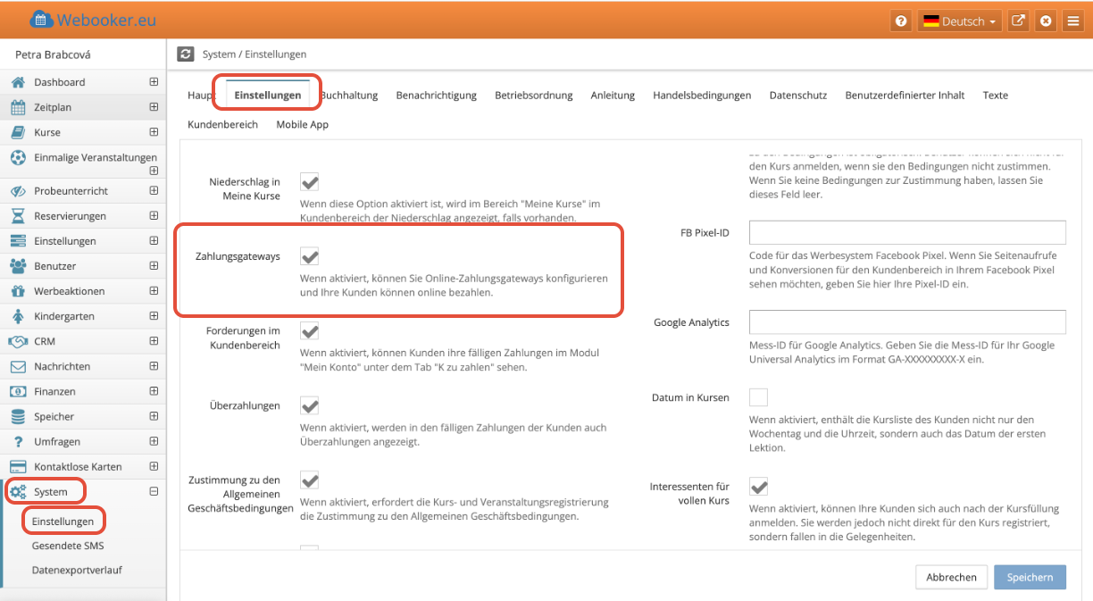 In System → Einstellungen zuerst die Funktion Zahlungsgateway aktivieren.