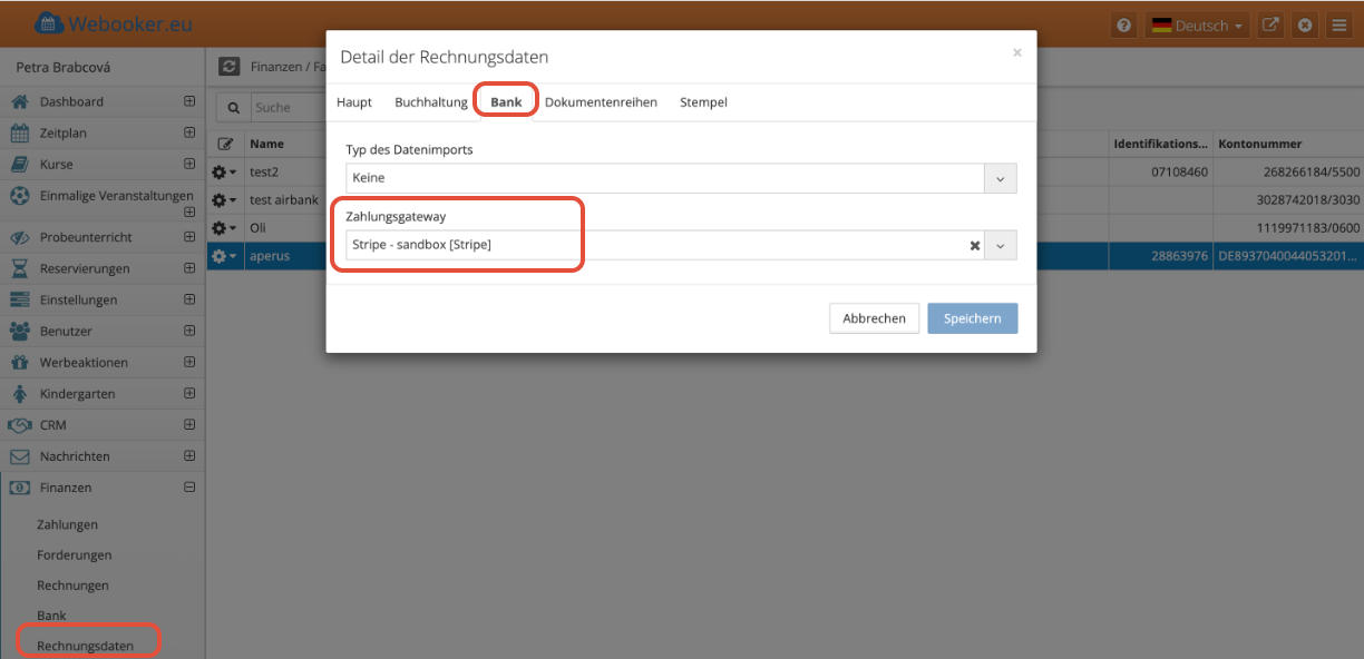 Im Bereich Bank wählen Sie Ihr Stripe-Gateway