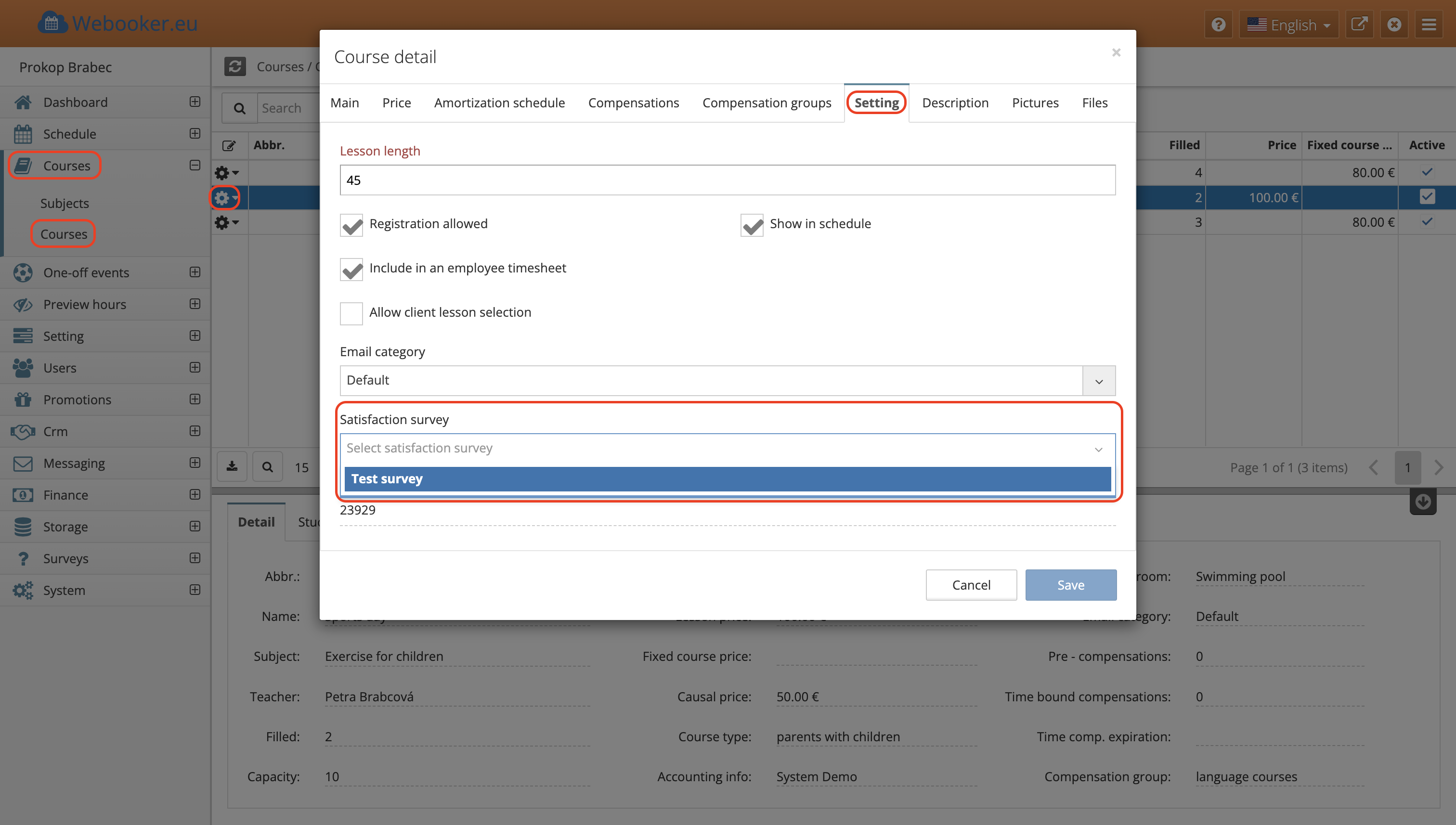 Go to the Courses module, click Courses, and select a specific course. Click options and edit. At the bottom of the Setting tab, select a survey that will be sent out to students in that course. You can also do this directly when creating a new course.