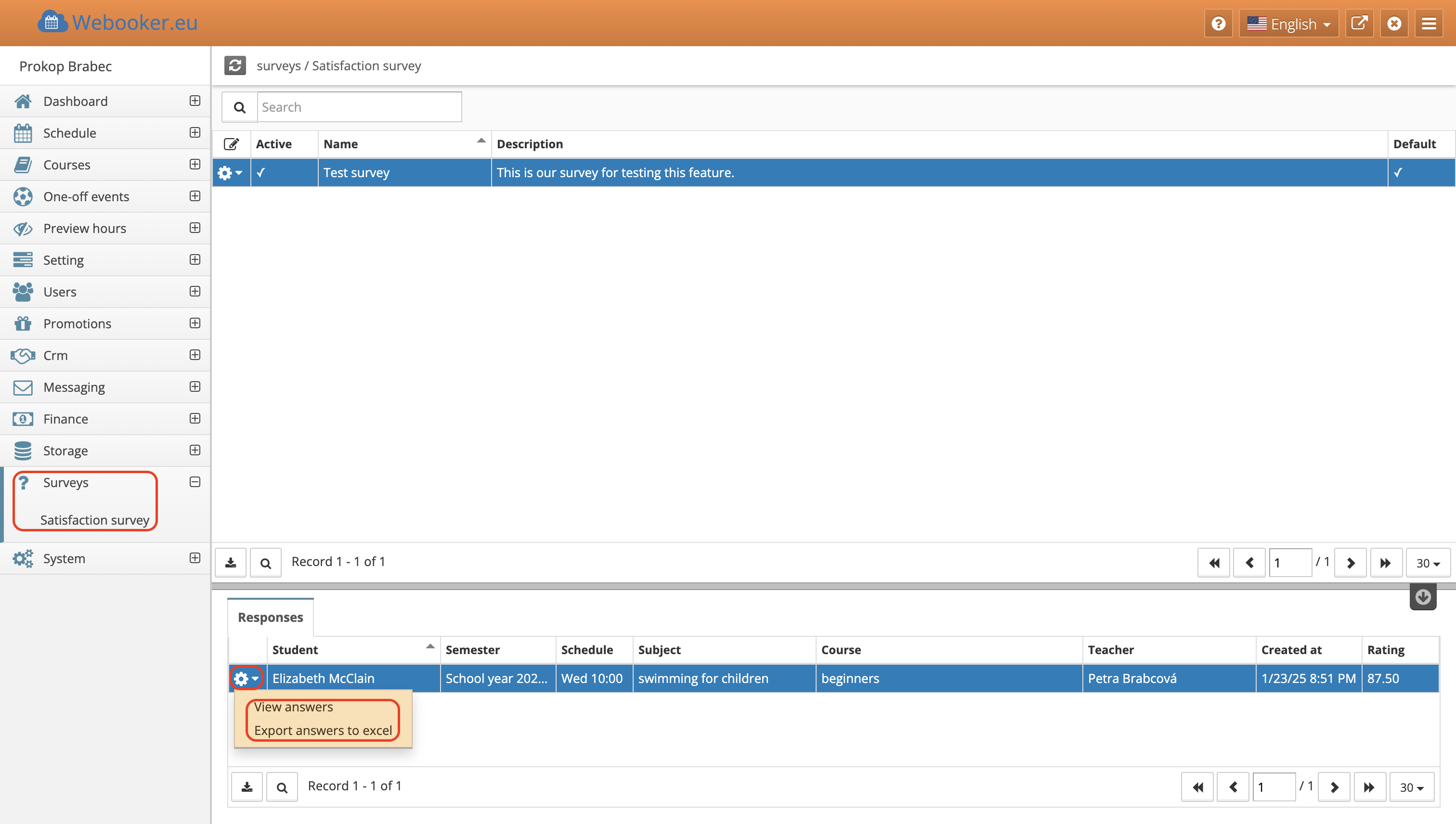 Survey results are stored under the Responses tab for each survey in Administration. View responses by clicking the gear icon next to a selected student and choosing View answers. You can also export survey responses to a Excel sheet.