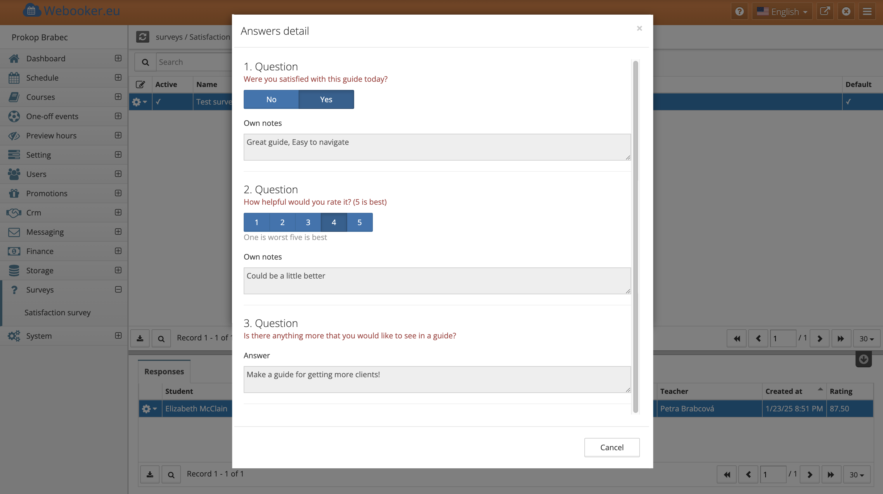 For each course or event, you can choose what survey will be sent (later in this guide, we will show you how). If no survey is selected, the default survey (if active) will be selected automatically. The survey will be sent at the end of each event, or the second to last hour of a course. In the case of a course, it will only be sent to participants with an attendance of at least 50%. Your clients can answer the survey directly from their email, and even on their phone. Their responses will be saved to the system.