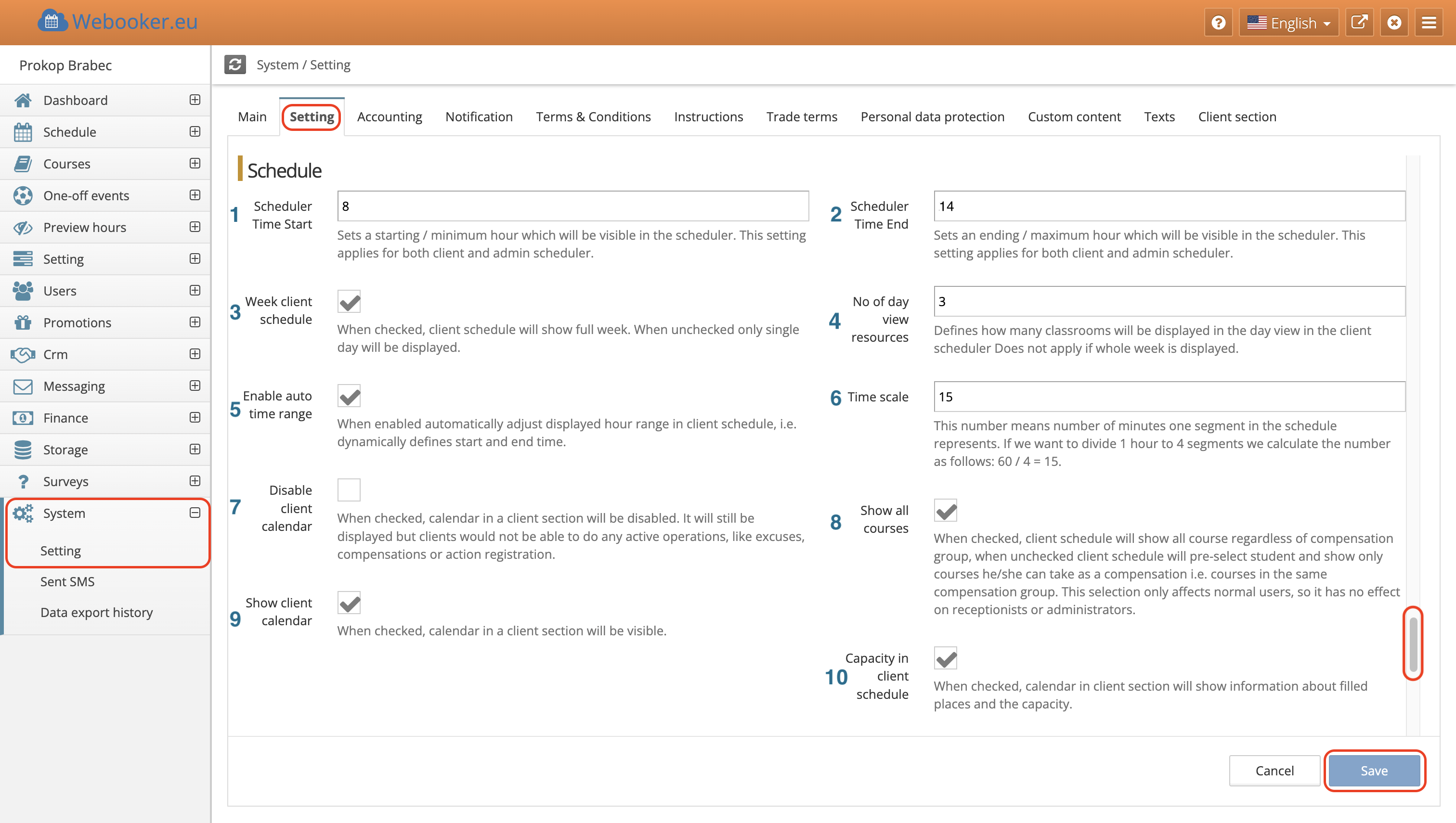 These settings change how clients view the schedule, the form and type of the schedule and various other options regarding the schedule can be found in the basic system settings. Before changes take place, they need to be saved.